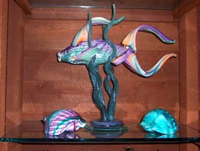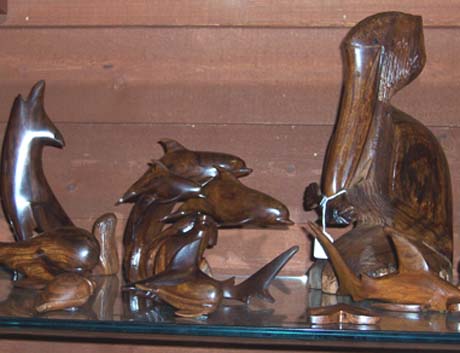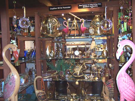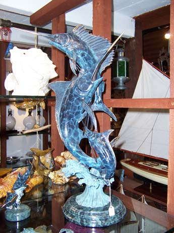Ever-changing items of brass, cast iron, glass, wood, even wire sculptings can be found here. Dolphins and Swordfish, pelicans and storks, lobsters and crabs, seashells and seaglass - the list is endless - are but a few of the coastal offerings created in a plethora of mediums. If nautical items are your favorite, you'll find ship's clocks, ship's wheels, hand made model schooners, sextants, and much more.